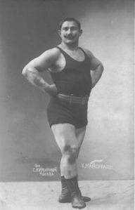 While we waited for the food to arrive I started to relax a little, allowing myself to openly gawk (whereas before I was surreptitiously investigating), which is when I noticed the TVs. They were all mounted high in the air above everyone’s heads, so somehow I hadn’t seen them when we came in. All of them had their sound turned off, and each one was showing a different video, some clearly from the 60s or 70s, but at least one looking fairly modern, and they were all of the guy from the pictures. He was demonstrating what I can only describe as Incredible Feats of Strength.